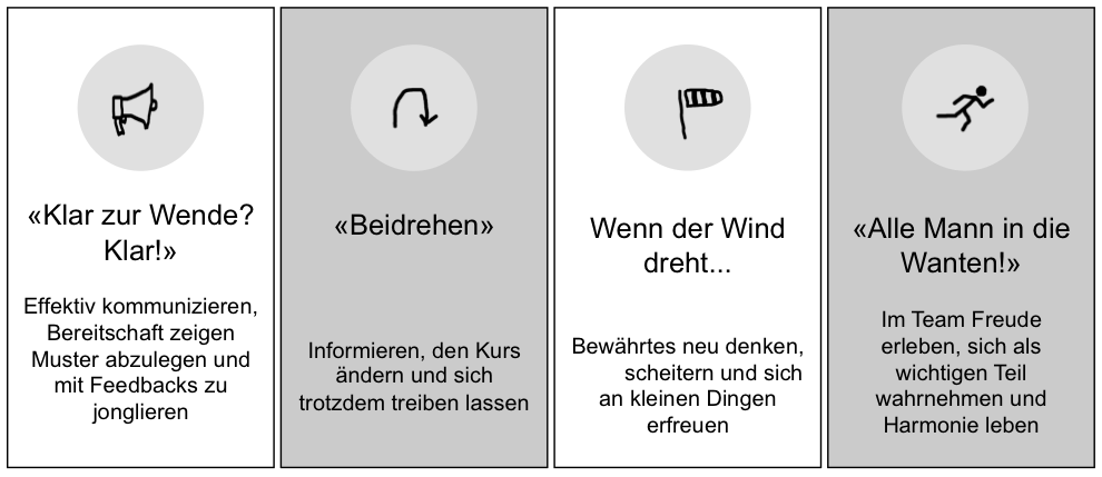 Über verschiedene Segelkommandos wird eine effektive Kommunikation geübt; beim Beidrehen kann reflektiert und kritisch hinterfragt werden; wenn der Wind dreht, müssen schnell unkonventionelle Lösungen her und nur als Team kann ein Segelschiff effizient geführt werden – siehe Grafik «Vier Grundkompetenzen seglerischen Handwerks».